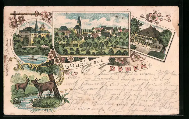Lithographie Döben, Ortsansicht, Schloss, Gasthof