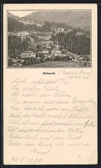 Lithographie Dölsach, Ortsansicht am Bergfuss
