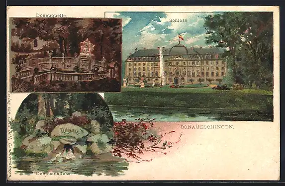 Lithographie Donaueschingen, Ansicht vom Schloss, Donauquelle