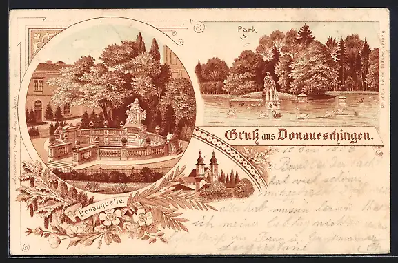 Lithographie Donaueschingen, Donauquelle mit Figurengruppe, Parkpartie mit Statue