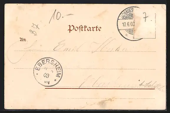 gelaufen 1903, Briefmarke entfernt, rückseitig Oberflächenschaden, Eckknick oben re., guter Zustand