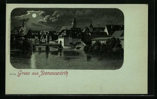 Lithographie Donauwörth, Ortsansicht mit Flusspartie