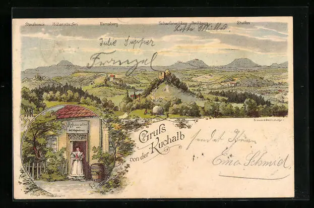 Lithographie Donzdorf, Gasthaus Kuchalb mit Umgebungspanorama