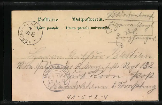 Personenbezogene Daten auf der Rückseite der Karte wurden durch blauen Textmarker unkenntlich gemacht. Die blauen Stellen sind auf die Vorderseite durchgeweicht und wirken sich negativ auf das Postkartenfoto aus