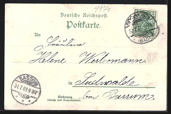 gelaufen 1901, Eckknick oben li., guter Zustand