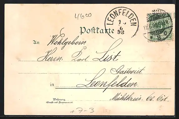 Personenbezogene Daten auf der Rückseite der Karte wurden durch blauen Textmarker unkenntlich gemacht. Die blauen Stellen sind auf die Vorderseite durchgeweicht und wirken sich negativ auf das Postkartenfoto aus
