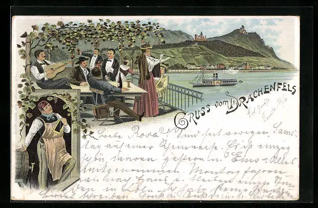 Lithographie Drachenfels, Flusspartie mit Dampfer