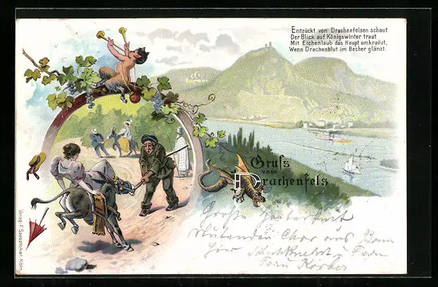 Lithographie Drachenfels, Flusspartie mit Königswinter und Booten