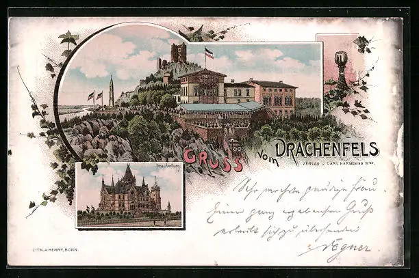 Lithographie Drachenfels, Hotel Drachenfels, Drachenburg