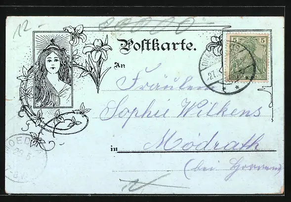 Personenbezogene Daten auf der Rückseite der Karte wurden durch blauen Textmarker unkenntlich gemacht. Die blauen Stellen sind auf die Vorderseite durchgeweicht und wirken sich negativ auf das Postkartenfoto aus