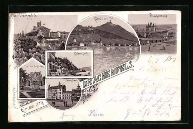 Lithographie Drachenfels, Ruine Drachenfels, Königswinter und Rolandseck