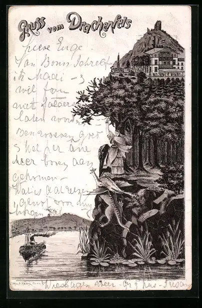 Lithographie Drachenfels, Ruine, Gasthaus, Dampfer