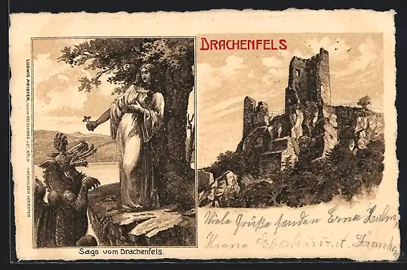 Lithographie Drachenfels, Sage vom Drachenfels, Burgruine