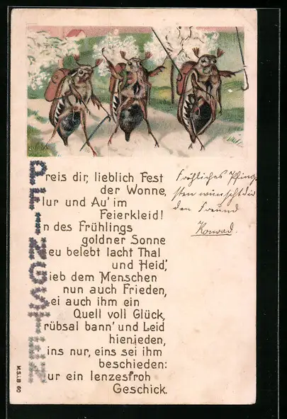 Lithographie Drei Maikäfer auf Wanderschaft unter blühenden Bäumen, Pfingstgruss