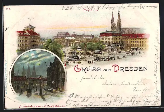 Lithographie Dresden, Annenstrasse mit Postgebäude, Postplatz