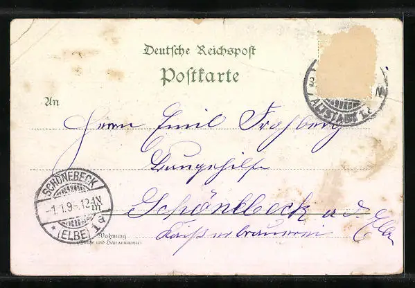 Personenbezogene Daten auf der Rückseite der Karte wurden durch blauen Textmarker unkenntlich gemacht. Die blauen Stellen sind auf die Vorderseite durchgeweicht und wirken sich negativ auf das Postkartenfoto aus