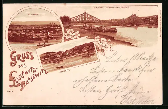 Lithographie Dresden-Blasewitz, Elbpartie mit Loschwitzer brücke, Totalansicht