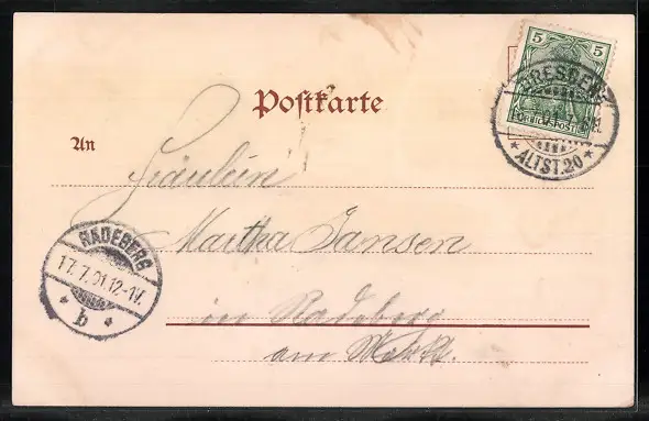 Personenbezogene Daten auf der Rückseite der Karte wurden durch blauen Textmarker unkenntlich gemacht. Die blauen Stellen sind auf die Vorderseite durchgeweicht und wirken sich negativ auf das Postkartenfoto aus