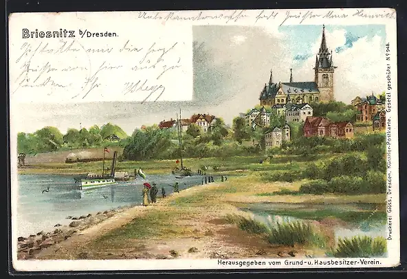 Lithographie Dresden-Briesnitz, Ortsansicht mit Kirche, Dampfer auf dem Fluss