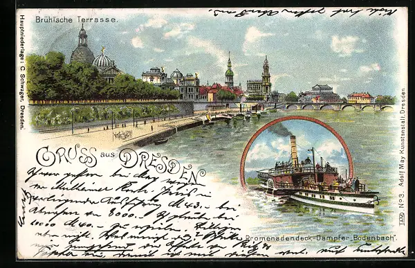 Lithographie Dresden, Brühlsche Terrasse, Promenadeneck-Dampfer Bodenbach