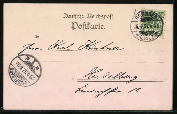 Personenbezogene Daten auf der Rückseite der Karte wurden durch blauen Textmarker unkenntlich gemacht. Die blauen Stellen sind auf die Vorderseite durchgeweicht und wirken sich negativ auf das Postkartenfoto aus