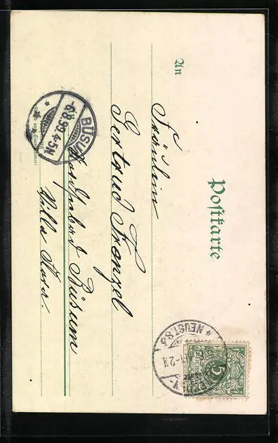 Personenbezogene Daten auf der Rückseite der Karte wurden durch blauen Textmarker unkenntlich gemacht. Die blauen Stellen sind auf die Vorderseite durchgeweicht und wirken sich negativ auf das Postkartenfoto aus