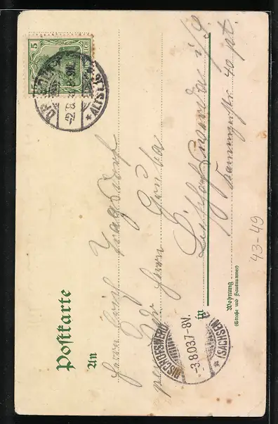 Personenbezogene Daten auf der Rückseite der Karte wurden durch blauen Textmarker unkenntlich gemacht. Die blauen Stellen sind auf die Vorderseite durchgeweicht und wirken sich negativ auf das Postkartenfoto aus