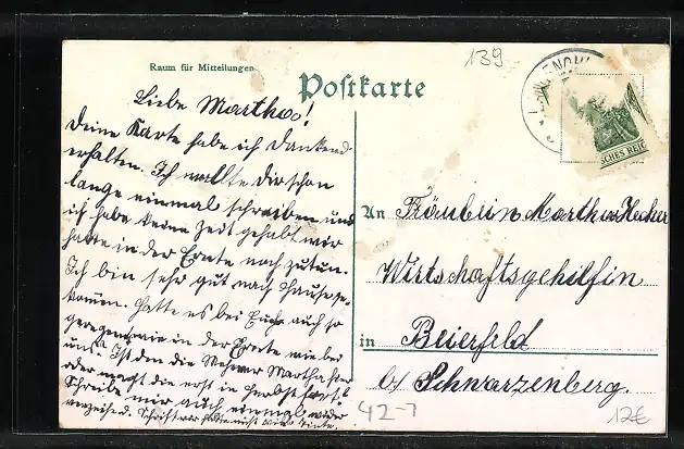 Personenbezogene Daten auf der Rückseite der Karte wurden durch blauen Textmarker unkenntlich gemacht. Die blauen Stellen sind auf die Vorderseite durchgeweicht und wirken sich negativ auf das Postkartenfoto aus