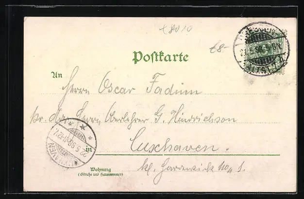 Personenbezogene Daten auf der Rückseite der Karte wurden durch blauen Textmarker unkenntlich gemacht. Die blauen Stellen sind auf die Vorderseite durchgeweicht und wirken sich negativ auf das Postkartenfoto aus