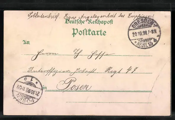 Personenbezogene Daten auf der Rückseite der Karte wurden durch blauen Textmarker unkenntlich gemacht. Die blauen Stellen sind auf die Vorderseite durchgeweicht und wirken sich negativ auf das Postkartenfoto aus