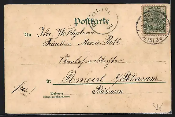 Personenbezogene Daten auf der Rückseite der Karte wurden durch blauen Textmarker unkenntlich gemacht. Die blauen Stellen sind auf die Vorderseite durchgeweicht und wirken sich negativ auf das Postkartenfoto aus