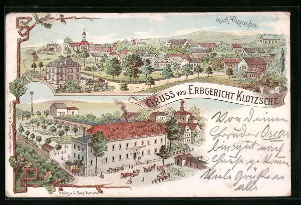 Lithographie Dresden-Klotzsche, Teilansicht, Gasthof Erbgericht
