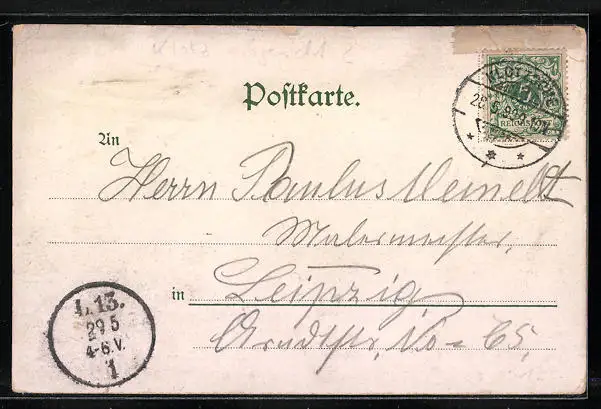 Personenbezogene Daten auf der Rückseite der Karte wurden durch blauen Textmarker unkenntlich gemacht. Die blauen Stellen sind auf die Vorderseite durchgeweicht und wirken sich negativ auf das Postkartenfoto aus