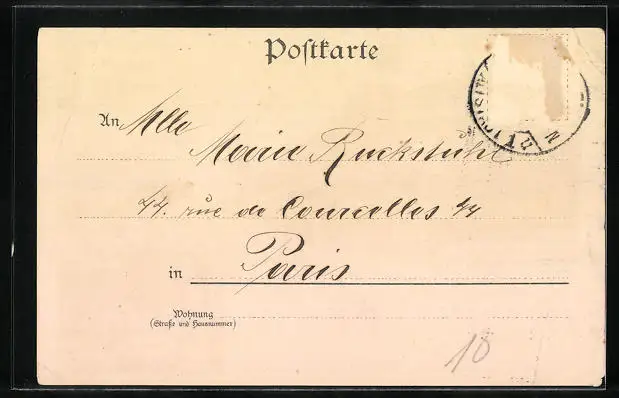 Personenbezogene Daten auf der Rückseite der Karte wurden durch blauen Textmarker unkenntlich gemacht. Die blauen Stellen sind auf die Vorderseite durchgeweicht und wirken sich negativ auf das Postkartenfoto aus