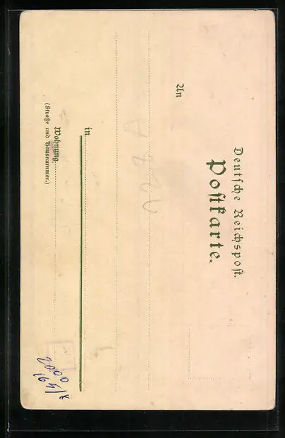 Personenbezogene Daten auf der Rückseite der Karte wurden durch blauen Textmarker unkenntlich gemacht. Die blauen Stellen sind auf die Vorderseite durchgeweicht und wirken sich negativ auf das Postkartenfoto aus