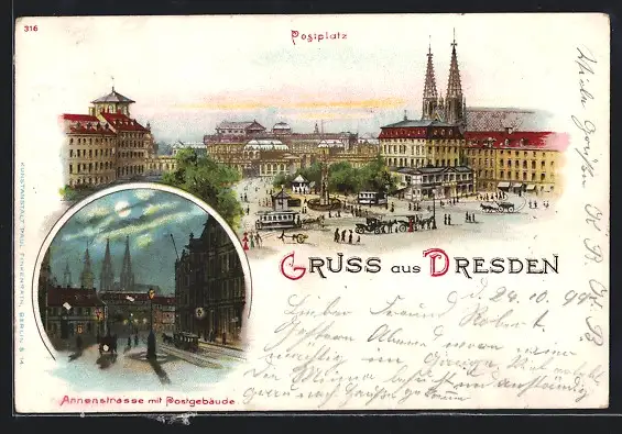 Lithographie Dresden, Postplatz, Annenstrasse mit Postgebäude