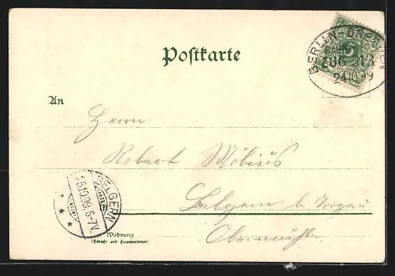 Personenbezogene Daten auf der Rückseite der Karte wurden durch blauen Textmarker unkenntlich gemacht. Die blauen Stellen sind auf die Vorderseite durchgeweicht und wirken sich negativ auf das Postkartenfoto aus