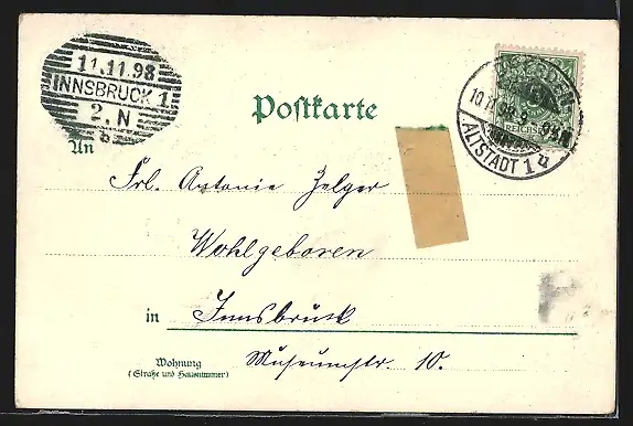 gelaufen 1898, rückseitig Klebe- und Papierreste, guter Zustand