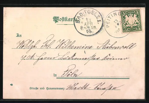 Personenbezogene Daten auf der Rückseite der Karte wurden durch blauen Textmarker unkenntlich gemacht. Die blauen Stellen sind auf die Vorderseite durchgeweicht und wirken sich negativ auf das Postkartenfoto aus