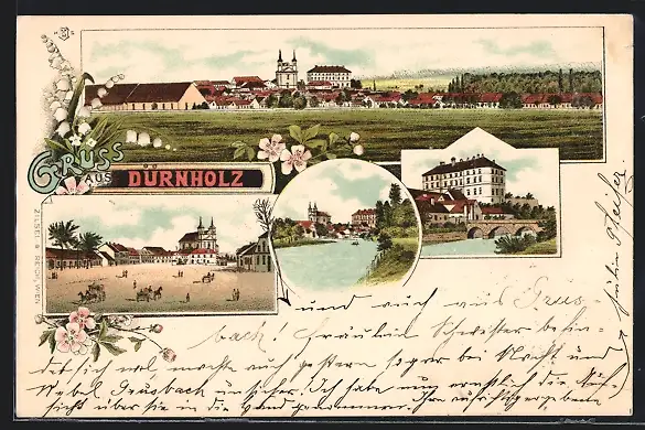 Lithographie Dürnholz, Ortsansicht, Ortspartie, Flusspartien