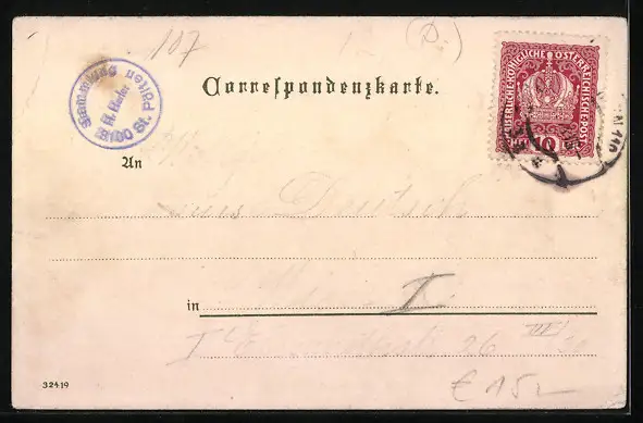 Personenbezogene Daten auf der Rückseite der Karte wurden durch blauen Textmarker unkenntlich gemacht. Die blauen Stellen sind auf die Vorderseite durchgeweicht und wirken sich negativ auf das Postkartenfoto aus