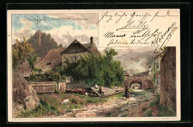 Lithographie Dürnstein a. d. Donau, Ortspartie mit Tor