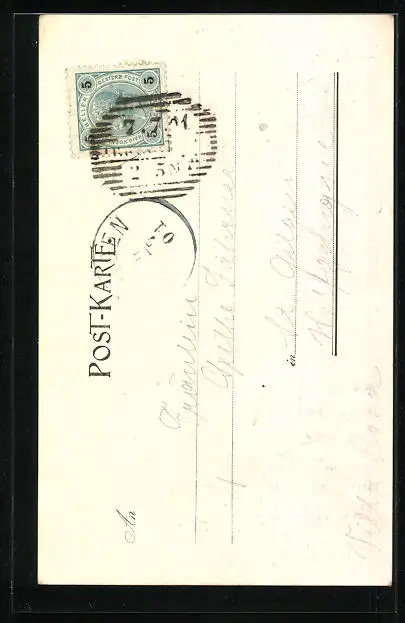 Personenbezogene Daten auf der Rückseite der Karte wurden durch blauen Textmarker unkenntlich gemacht. Die blauen Stellen sind auf die Vorderseite durchgeweicht und wirken sich negativ auf das Postkartenfoto aus