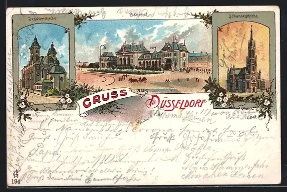 Lithographie Düsseldorf, Bahnhof, Jesuitenkirche, Johanneskirche