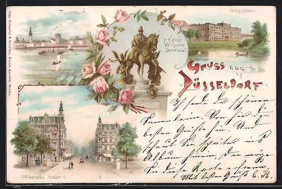 Lithographie Düsseldorf, Kaiser Wilhelm Denkmal, Postgebäude, Elberfelder Strasse, Uferpartie
