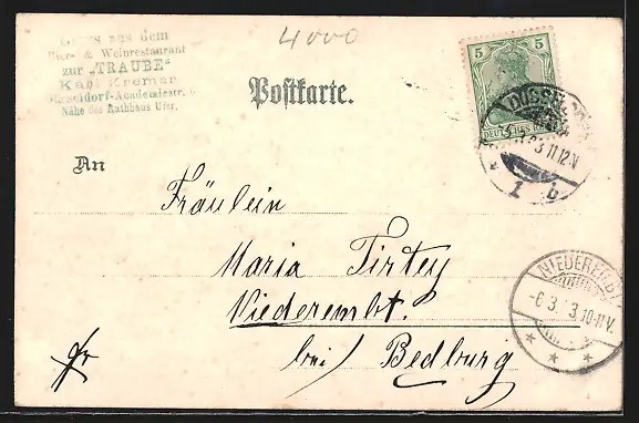 Personenbezogene Daten auf der Rückseite der Karte wurden durch blauen Textmarker unkenntlich gemacht. Die blauen Stellen sind auf die Vorderseite durchgeweicht und wirken sich negativ auf das Postkartenfoto aus