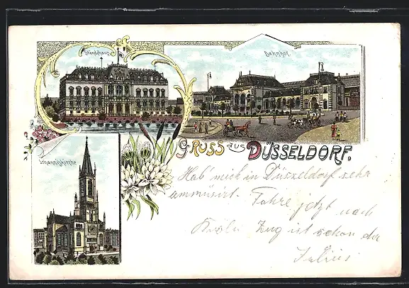Lithographie Düsseldorf, Ständehaus, Johanniskirche, Bahnhof