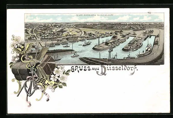 Lithographie Düsseldorf, Totalansicht des neuen Rheinhafens