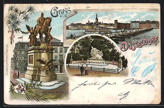 Lithographie Düsseldorf, Totale, Krieger-Denkmal, Kaiser-Wilhelm-Denkmal