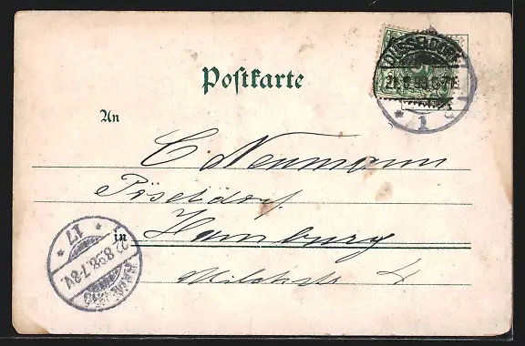 Personenbezogene Daten auf der Rückseite der Karte wurden durch blauen Textmarker unkenntlich gemacht. Die blauen Stellen sind auf die Vorderseite durchgeweicht und wirken sich negativ auf das Postkartenfoto aus